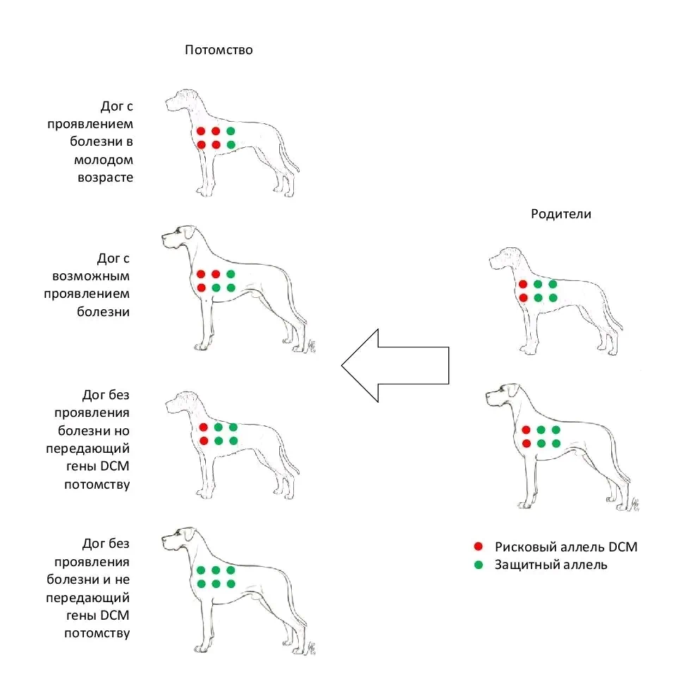 DCM имеет у догов частоту до 30% в популяции, это означает, что почти все доги несут в себе DCM триггерные, рисковые гены. Таким образом, невозможно исключить из разведения всех животных, в родстве с которыми обнаружилась DCM, потому что тогда просто не останется собак для размножения.